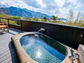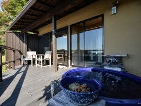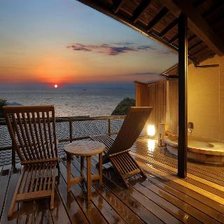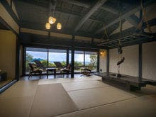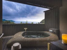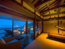 駿河湾と美しい夕日の絶景を一望する古民家風離れ。全8棟の源泉かけ流し露天風呂付客室で優雅なひとときを